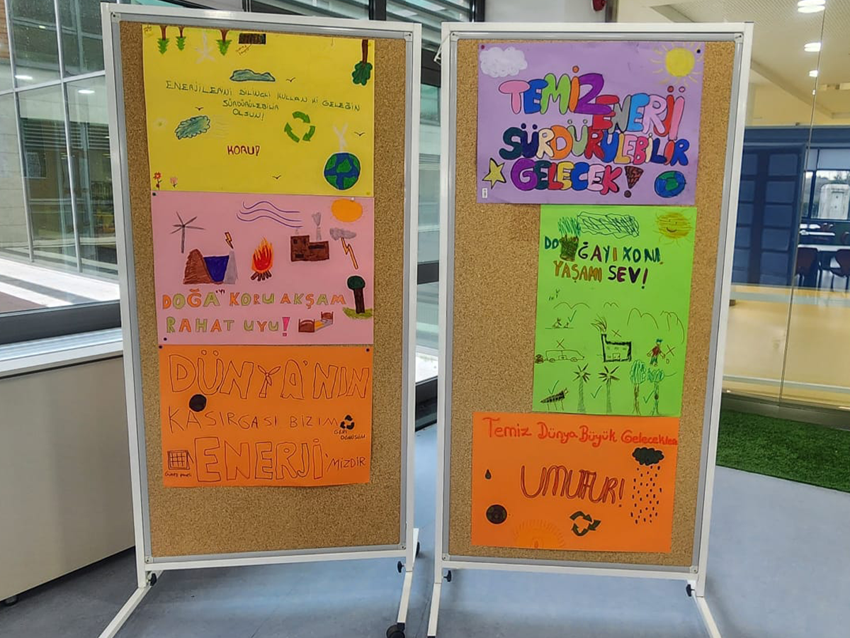 Yaratıcı üretim aşamasında öğrenciler gruplara ayrılarak rüzgâr, güneş veya su enerjisinin önemini anlatan sloganlar tasarladı. Büyük boy kâğıtlar ve boyama malzemeleri kullanan öğrenciler, sloganlarını görsellerle destekledi. Çalışmanın sonunda “En İyi Slogan” ve “En İyi Görsel” başlıklarıyla küçük bir değerlendirme yapılırken; hazırlanan çalışmalar sergi alanına yerleştirildi. Öğretmen yaptığı kısa değerlendirmeyle çalışmaları, sürdürülebilir enerji bilinci açısından ele aldı. Atölye, öğrencilere yöneltilen “Sizce bugün öğrendiğimiz hangi enerji türü geleceğimiz için daha önemli?” sorusu ve alınan kısa geri bildirimlerle tamamlandı. Etkinlik, öğrencilerin edebi metinlerle bağ kurmasını ve çevresel farkındalık kazanmasını sağlayan disiplinler arası bir öğrenme deneyimi sundu.