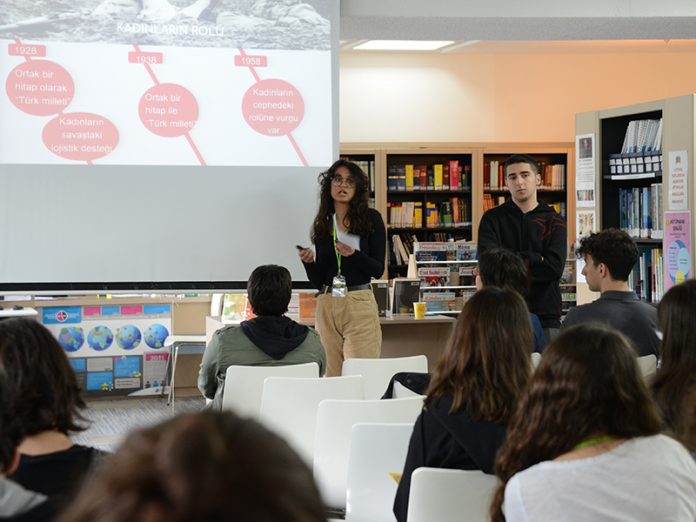 Alkan, uzun yıllar Tarih ders kitapları yazan Enver Behnan Şapolyo’nun 1950, 1959, 1960, 1972 yıllarında yazmış olduğu kitaplarda, Tarih anlatımının nasıl değiştiğini örneklerle aktardı. Öğrencilerimiz, değişen siyasi iklimin aynı yazarın kaleminden Tarih ders kitaplarına nasıl yansıdığını gördü. Alkan, öğrencilerimizin sorularını yanıtladıktan sonra konferans sona erdi.