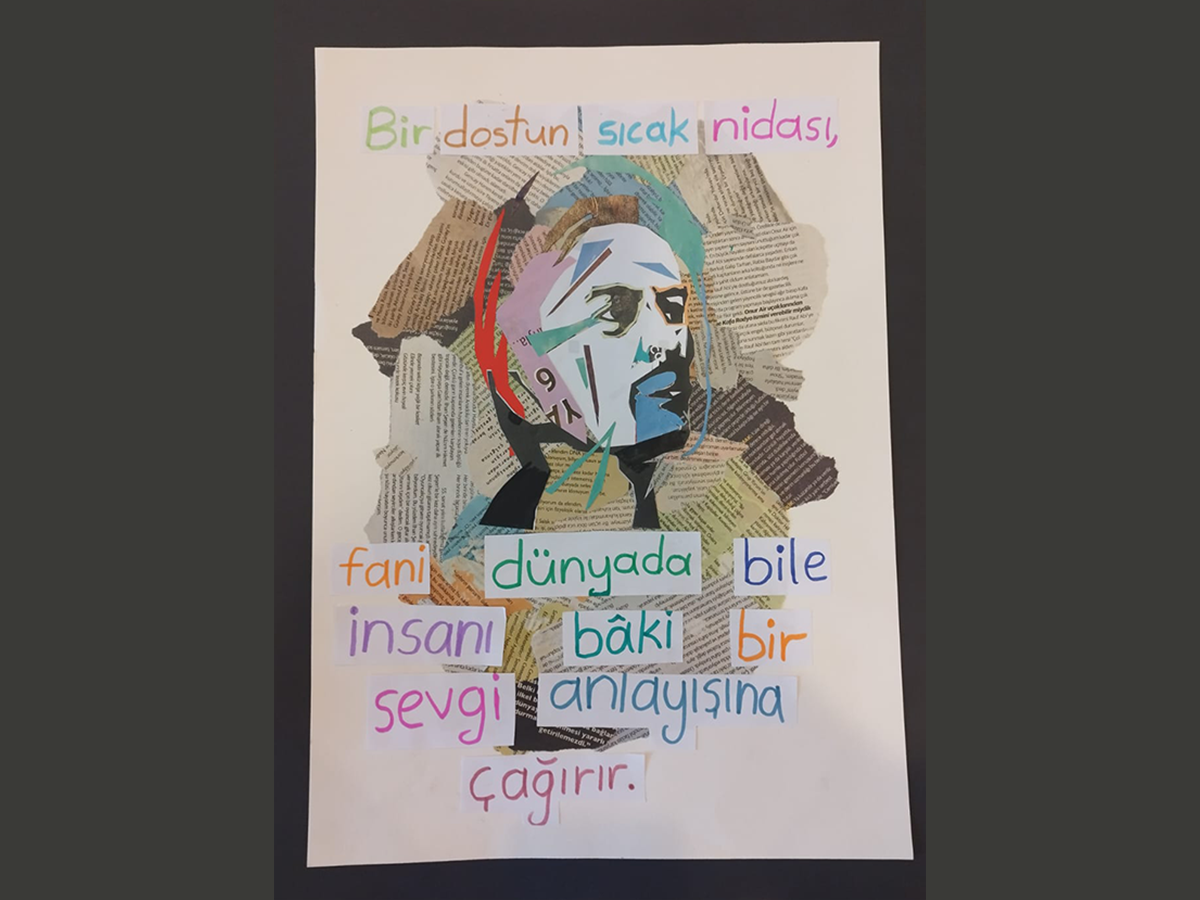 Sevgi ve hoşgörünün önemine dikkat çekerek afiş tasarlayan öğrencimiz, kolaj çalışmasındaki cümleyi Yunus Emre’nin şiirlerinden seçtiği sözcüklerle oluşturdu.