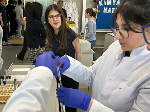 boyunca öğrencilerimiz, çeşitli deney süreçlerini ziyaretçilerle birlikte yürüttü. İstasyon şeklinde gerçekleştirilen deneylerin her adımında hem teorik açıklamalar yapıldı hem de deney aşamaları uygulandı. Öğrencilerimiz ve ziyaretçiler aynı masada çalışarak kimyanın günlük yaşamla kesiştiği noktaları birlikte inceledi.